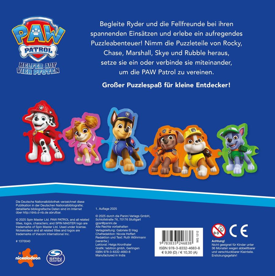 Begleite Ryder und die Fellfreunde bei ihren spannenden Einsätzen und erlebe ein aufregendes Puzzleabenteuer! Nimm die Puzzleteile von Rocky, Chase, Marshall, Skye und Rubble heraus, setze sie ein oder verbinde sie miteinander, um die PAW Patrol zu vereinen. Großer Puzzlespaß für kleine Entdecker!