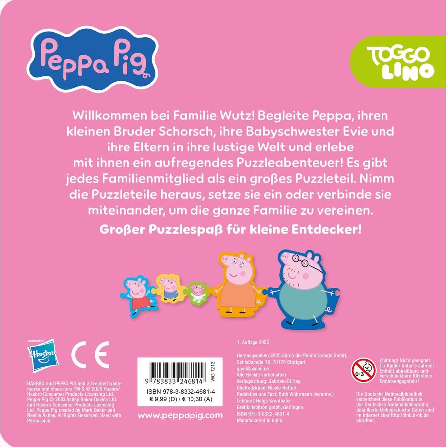 - Durchgehend vierfarbig; 6 herausnehmbare Puzzleteile mit Peppa und ihrer Familie (zwischen 4 und 14 cm Höhe), 5 davon lassen sich zu einer Kette zusammenpuzzeln