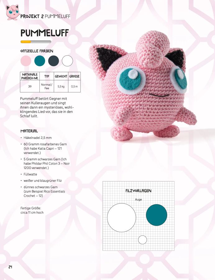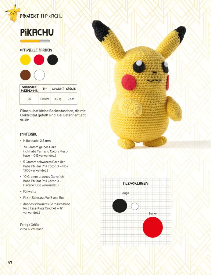 Das große Häkelbuch enthält Anleitungen für Pikachu, Gengar, Pichu, Evoli, Mauzi, Enton, Glumanda, Schiggy, Bisasam und viele mehr.
