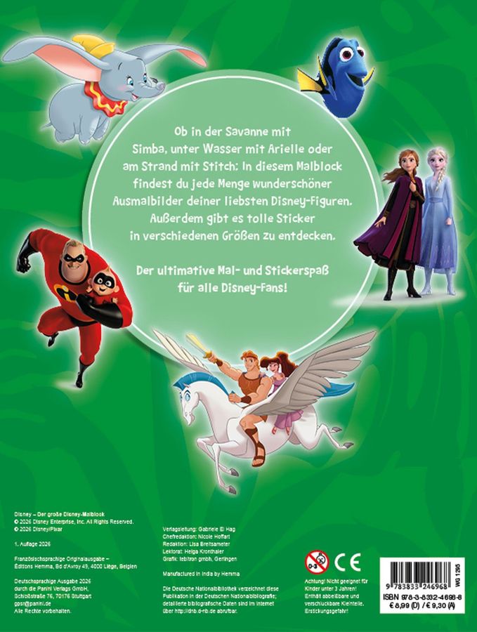 Ob in der Savanne mit Simba, unter Wasser mit Arielle oder am Strand mit Stitch: In diesem Malblock findest du jede Menge wunderschöner Ausmalbilder deiner liebsten Disney-Figuren. Außerdem gibt es tolle Sticker in verschiedenen Größen zu entdecken. Der ultimative Mal- und Stickerspaß für alle Disney-Fans!