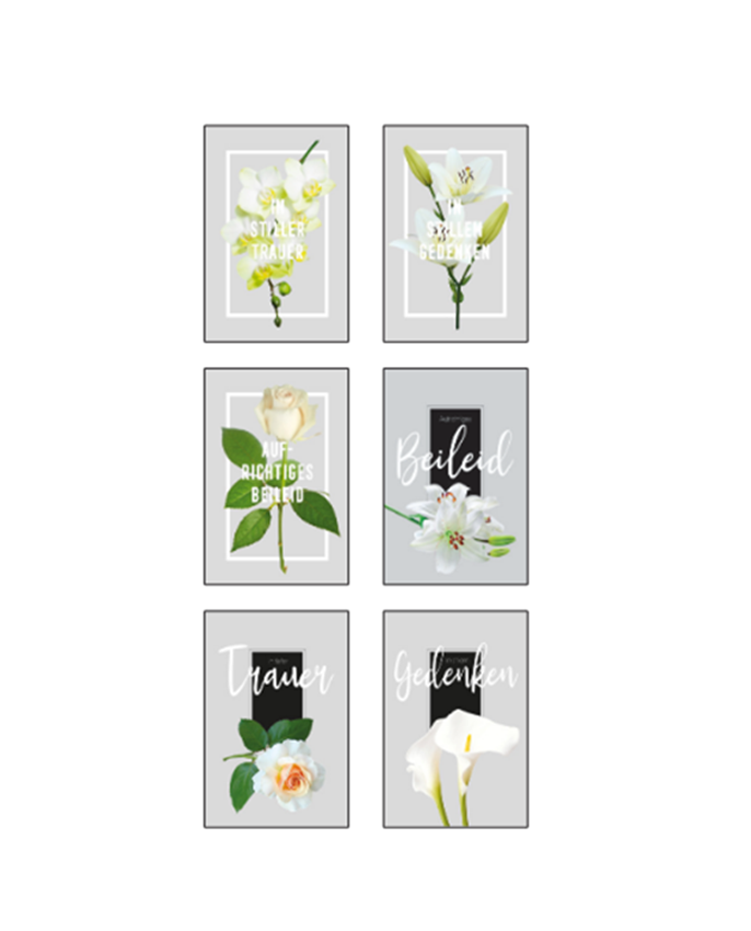 Ein 50er-Sortiment besteht aus 6 unterschiedlichen Doppelkarten inklusive Briefumschlägen im Format 11,5 × 17,5 cm. Die Motive können gegebenenfalls geringfügig