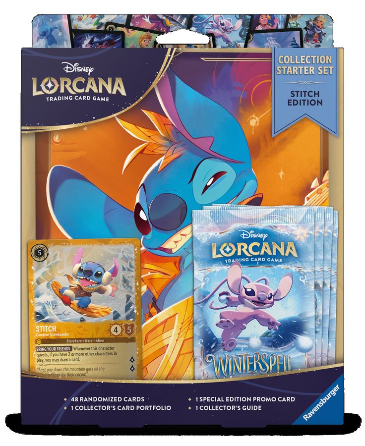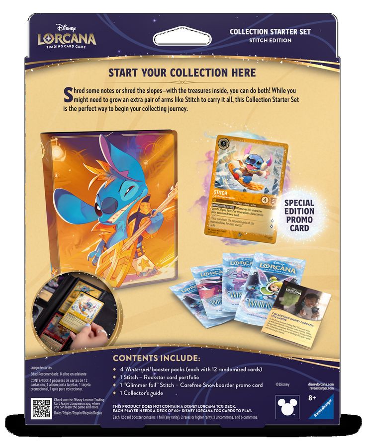 Im Starterpaket findest du 4 Booster Packs aus dem Set „Winterzauber“ mit insgesamt 48 spektakulären Karten. In dem spektakulären Stitch - Rockstar Sammelalbum, das Platz für bis zu 80 Karten bietet, kannst du deine Sammlung sicher aufbewahren. Die besondere Promokarte Stitch - Sorgloser Snowboarder besticht durch eine atemberaubende Glimmer-Folienveredelung und verleiht deiner Sammlung zusätzlichen Glanz.