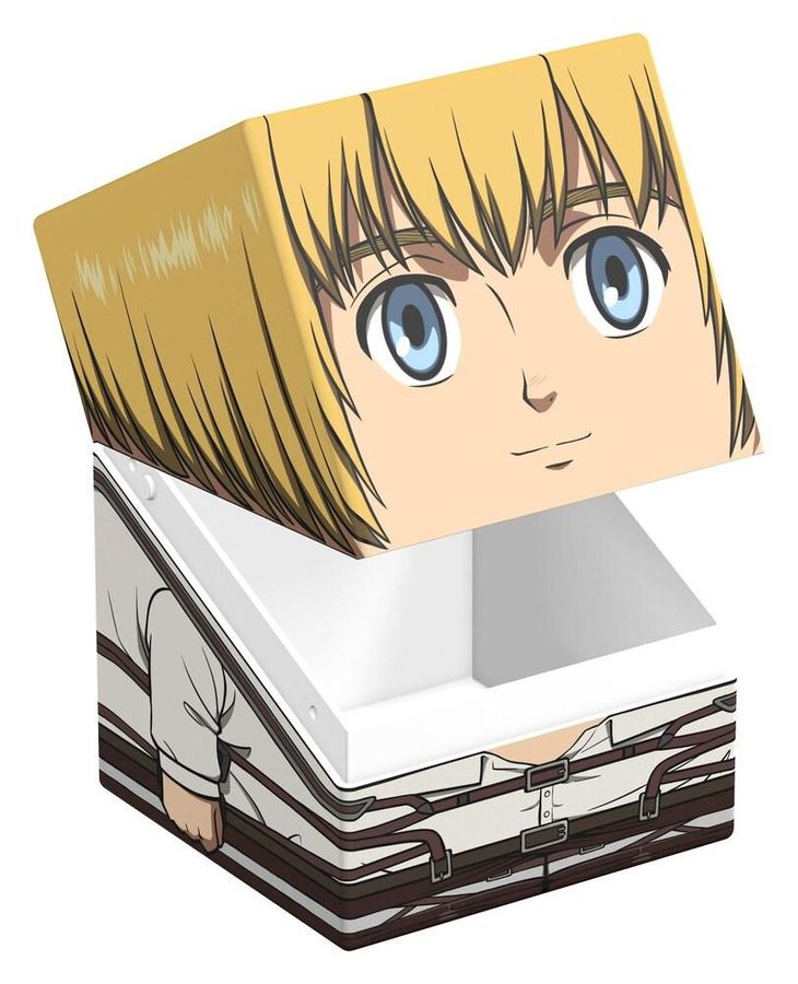 Sammelbare Box zur Aufbewahrung von TCG-Decks, Tabletop-Zubehör und/oder Sammlerstücken. Der Armin Arlert Squaroe aus der Attack on Titan-Edition bietet als Deck-Box benutzt Platz für bis zu 100 Spielkarten in doppelter Schutzhülle. Squaroes werden aus 78% erneuerbaren Rohstoffen hergestellt und passen perfekt in das separat erhältliche Collectors Case.