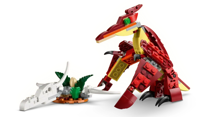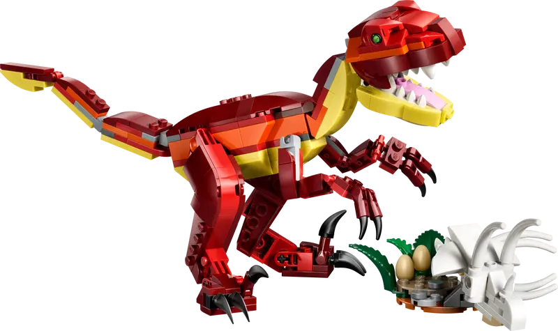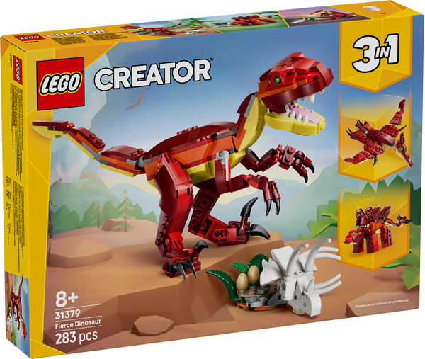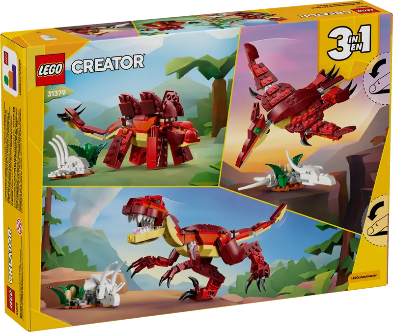 Das LEGO® Creator 3-in-1-Set Wilder Dinosaurier (31379) enthält alles, was Kinder ab 8 Jahren brauchen, um unzählige Urzeit-Abenteuer zu erleben. Das detailreiche Spielset bietet 3 verschiedene Bauoptionen mit denselben LEGO Steinen. Jungen und Mädchen können zunächst einen Velociraptor bauen, der Kiefer, Kopf, Arme, Beine und Schwanz bewegen kann. Diese Spielzeugfigur kann man dann in einen Stegosaurus umbauen, der Hals, Kopf und Beine bewegen kann, oder in einen Flugsaurier mit beweglichen Flügeln und Füßen und schwenkbarem Kopf. Jedes dieser Modelle wird durch einen Dino-Schädel, einen Brustkorb, Dino-Eier und eine Pflanze vervollständigt. Nach dem Spielen kann eines der drei Modelle als Zimmerdeko ausgestellt und von der ganzen Familie bestaunt werden. Dieses LEGO Creator 3-in-1-Set weckt die Fantasie und ist ein tolles Geschenk für Jungen und Mädchen. Darüber hinaus bietet die LEGO Builder App mit ihren digitalen Bauanleitungen ein faszinierendes Bauabenteuer. In der App können Kinder 3D-Modellansichten vergrößern und drehen und ihren Baufortschritt verfolgen. Die Modelle können jedoch nicht gleichzeitig gebaut werden!