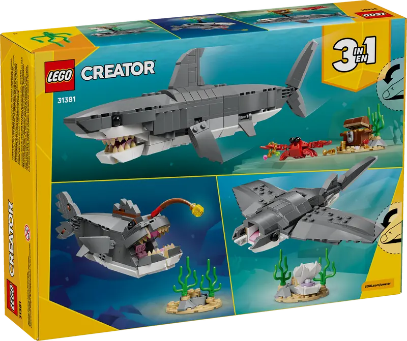 Das LEGO® Creator 3-in-1-Set Wilder Hai mit Schatztruhe (31381) ist ein Bauspielzeug, mit dem Jungen und Mädchen ab 8 Jahren spannende Unterwasserabenteuer erleben können. Dieses imposante Set bietet Kindern 3 verschiedene Bauoptionen mit denselben LEGO Steinen. Kinder können zunächst einen beweglichen Spielzeughai bauen und ihn dann auf einem Ständer zusammen mit einer Schatztruhe und einer Krabbe ausstellen. Das Modell kann man in einen Seeteufel auf einem Ständer mit Meerespflanzen oder in einen Mantarochen auf einem Ständer mit Muschelschale umbauen. Nach all dem Bau- und Spielspaß kann eines dieser Modelle als Zimmerdeko ein Regal oder den Schreibtisch schmücken. Dieses LEGO Creator 3-in-1-Set weckt die Fantasie und ist eine tolle Geschenkidee für Kinder, die Meerestiere lieben. Außerdem bietet die LEGO Builder App mit ihren digitalen Bauanleitungen ein faszinierendes Bauabenteuer. In der App können Kinder 3D-Modellansichten vergrößern und drehen, ihren Baufortschritt verfolgen und Sets an einem Ort speichern. Die Modelle können jedoch nicht gleichzeitig gebaut werden!