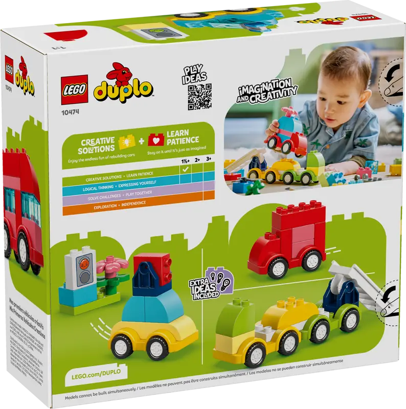 LEGO® DUPLO® Kreative Fahrzeuge (10474) bietet Kleinkindern ein unendlich kreatives Spielerlebnis. Dieses Lernspielzeug für Kinder ab 18 Monaten besteht aus jeder Menge Bausteine, Teile und beweglicher Funktionen, die Kleinkinder unendlich kreative Modelle bauen lassen. Zunächst können Kleinkinder die Hauptmodelle bauen, das heißt einen LEGO DUPLO Hubschrauber, einen Kipplaster mit hochklappbarer Kippmulde, ein Löschauto mit Klappleiter und eine kleine „Familienkutsche“. Beim Zerlegen dieser Spielzeugautos sind dann die Fingerfertigkeit und die Hand-Augen-Koordination gefordert. Mit Kreativität und zusätzlichen Steinen erschaffen die Kinder völlig andere Modelle. Kleinkinder können die LEGO DUPLO Bausteine völlig neu und absolut überraschend zu Polizeiautos, einem LKW mit Überlänge oder einem Doppeldeckerbus zusammenfügen. Die entwicklungsfördernden LEGO DUPLO Spielzeuge bestehen aus gut greifbaren Bausteinen und faszinierenden Funktionen, um Kleinkinder die ersten Schritte auf ihrer LEGO Baureise selbstbewusst gehen zu lassen.