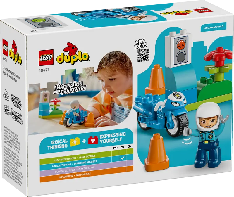 LEGO® DUPLO® Town Blaues Polizeimotorrad (10471) ist ein Spielset, das Kleinkindern ab 2 Jahren ein rasantes Spielerlebnis bietet. Kleinkinder können die Polizistin auf ihrem coolen LEGO DUPLO Motorrad den Straßenverkehr kontrollieren lassen. So bringt ihnen das Lernspielzeug einige Regeln für das Miteinander bei. Dieses kleine Set ist ein tolles Geburtstagsgeschenk oder eine schöne spontane Belohnung für Kinder ab 2 Jahren, die Spielzeug-Blaulichtfahrzeuge lieben. Zum Set gehören eine Polizistin, ein Stein mit aufgedruckter Ampel und 2 Verkehrshütchen. LEGO DUPLO Sets enthalten bunte Bausteine und verschiedene Figuren für spannende Geschichten, um die natürliche Neugier von Kleinkindern zu wecken und ihnen bei wichtigen Entwicklungsschritten zu helfen. Wenn Kleinkinder die LEGO DUPLO Polizistin aufs Motorrad setzen und um die Verkehrshütchen kurven lassen, üben sie ihre Fingerfertigkeit. Mit der Spielzeugampel können Eltern ihrem Kind beibringen, dass es bei Rot stehen bleiben muss und bei Grün wieder losbrausen darf.