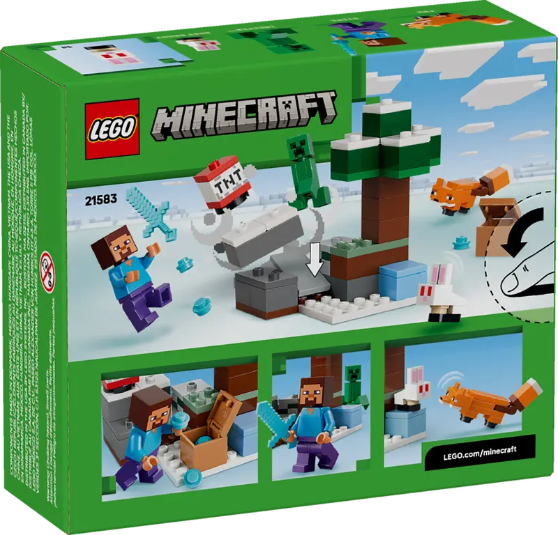 Steves Abenteuer in der Taiga (21583) ist ein Set zum Sammeln, Bauen und Spielen, das Minecraft® Spieler ab 6 Jahren den Videospielspaß in einer völlig anderen Dimension erleben lässt. Dieses kleine LEGO® Set bietet jede Menge Actionspaß bei einer Schatzsuche. Die Minifigur Steve, ein Creeper™ und zwei LEGO Figuren (Fuchs und Babyhase) laden Kinder zum Spielen ein. Kinder begleiten den Videospielhelden Steve, der im Taiga-Biom Diamanten schürft. Dort steht eine Fichte, und Schnee bedeckt das Taiga-Gras. Eine Explosionsfunktion lässt das TNT das Gestein aufsprengen, um Diamanten freizulegen, die in der Schatztruhe aufbewahrt werden können. Mit seinem Diamantschwert muss Steve den feindseligen Creeper verscheuchen. Das Set ist ein tolles Geschenk für Minecraft-Spieler und LEGO Baufans, die Gaming-Deko lieben. Und die LEGO Builder App mit verständlichen digitalen Bauanleitungen lässt Kinder selbstbewusst bauen, 3D-Modellansichten vergrößern und drehen und den Baufortschritt verfolgen.