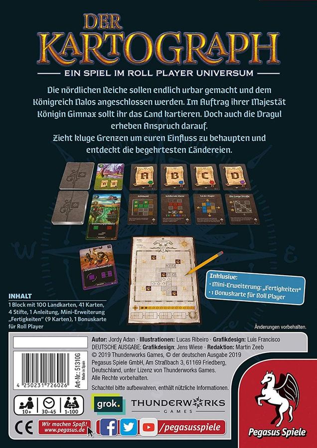 Die nördlichen Reiche sollen endlich urbar gemacht und dem Königreich Nalos angeschlossen werden. Im Auftrag ihrer Majestät Königin Gimnax sollen die Spieler das Land kartieren. Doch auch die Dragul erheben Anspruch darauf. Die Kartographen müssen kluge Grenzen ziehen, um sich zu behaupten und dabei die begehrtesten Ländereien entdecken. Der Kartograph ist ein Flip & Write-Spiel aus dem Roll Player-Universum. Bis zu 100 Spieler können hier darum konkurrieren, die besten Ländereien zu kartographieren. Schnell macht dabei ein clever eingezeichneter Dragul dem Mitspieler einen Strich durch die Rechnung.