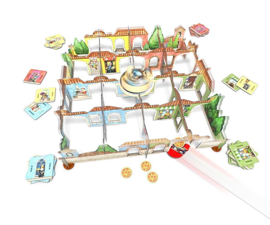 Pizzabote Luigi kennt jede Gasse der kleinen Stadt Rabazza. Doch die Erschütterungen aus Pinos Backstube fordern seine Fahrkünste heraus. Denn wo alle Wände zittern, kommen dem flinken Boten manche Fenster und Türen erschreckend nahe. Dort greifen dann oft die völlig falschen Einwohner begeistert zu. Abwechselnd steuern die Spieler Luigi auf seinem Motorroller durch die wackelnde Stadt. Verbunden mit einem Schieber, den die Spieler von den Stadtmauern aus bewegen können, ist jeder Winkel aller vier Stadtviertel erreichbar. Super-Luigi und Star-Pizzabote nennen darf sich, wer als Erster jede bestellte Pizza ausgeliefert hat. Für Jung und Alt, Einsteiger und Fortgeschrittene bietet die Spielregel gleich zwei Spielvarianten, bei denen pro Spielzug entweder eine oder gleich vier Pizzas zu hungrigen Kunden gebracht werden können. Das Wackeln der Stadt wird über ein aufziehbares Wind-Up-Gerät erzeugt, das gleichzeitig die Zeit limitiert, in der Luigi durch die Stadt flitzen darf. Das Spiel ist nicht nur wegen seiner spektakulären Wackel-Mechanik ein echter Augenschmaus. „Piazza Rabazza ist ein aktionsgeladener Spielspaß, der nicht nur bei Kindern Geschick, Konzentration, Schnelligkeit und schlaues Planen herausfordert. Nur Pizzaessen ist ab und zu noch schöner … Ersonnen haben das verblüffende Spiel Guido Hoffmann und Jens-Peter Schliemann. Die temperamentvollen italienischen Illustrationen stammen aus der Feder von Dennis Lohausen.
