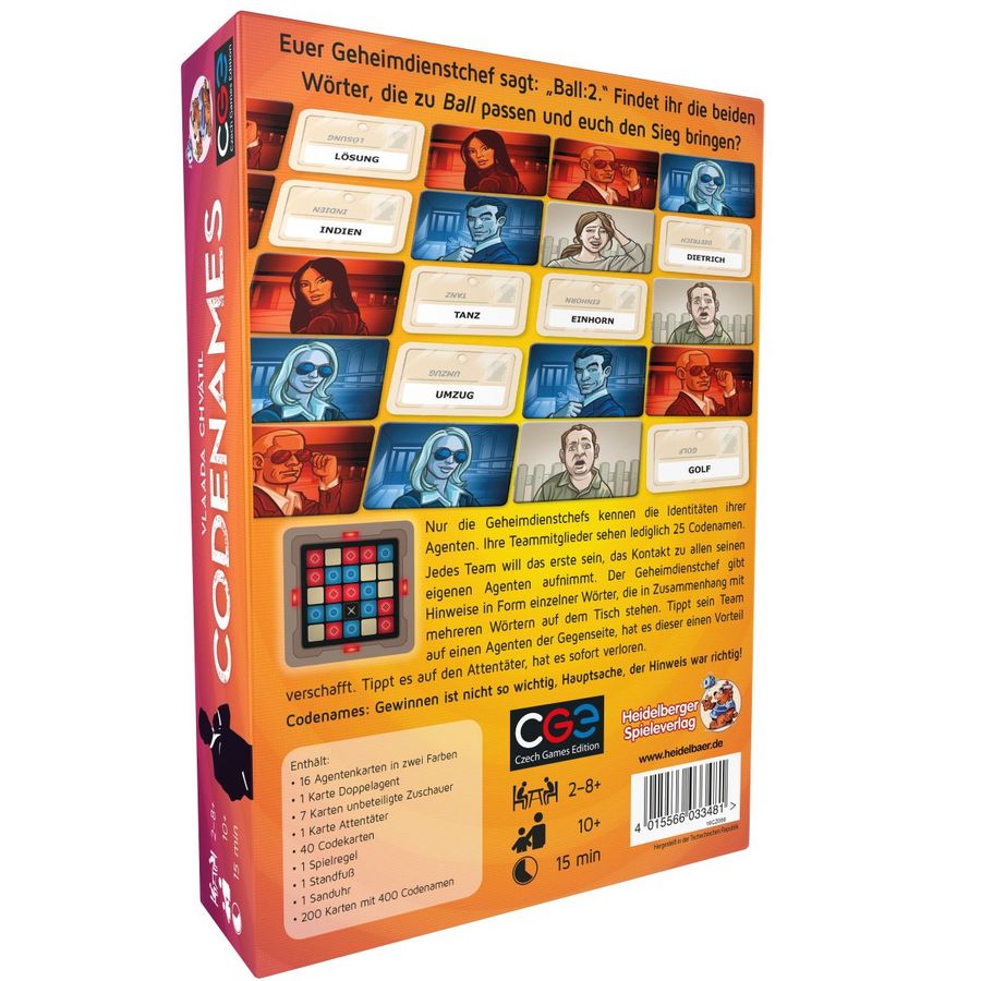 Lieferumfang: 16 Agentenkarten in zwei Farben, 1 Karte Doppelagent, 7 Karten unbeteiligte Zuschauer, 1 Karte Attentäter, 40 Codekarten, 1 Spielregel, 1 Standfuß, 1 Sanduhr, 200 Karten mit 400 Codenamen