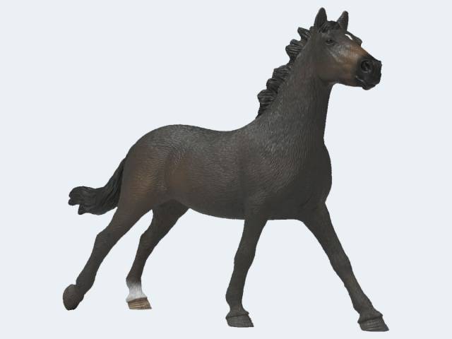 Die Englische Vollblut Stute ist eine elegante Erscheinung: Sie hat schwarzbraunes Fell und ihre dichte Mähne und der lange Schweif glänzen schwarz. Nur die zierlichen Hufe sind grau abgesetzt. Am linken Hinterlauf ist das Fell über dem Huf etwas weiß. Das sieht aus wie eine Socke.