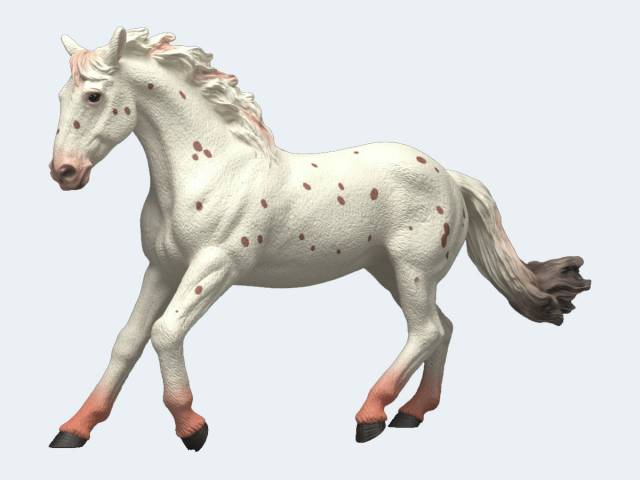 Die elegante Knabstrupper Stute hat weißes Fell mit braunen Tupfen. Auch ihre Mähne und ihr Schweif sind weiß mit ein paar braunen Strähnen darin. Die hübsche Fellzeichnung kot besonders gut zur Geltung, wenn sie wie jetzt dynamisch über die Weide galoppiert. Was für ein Anblick!