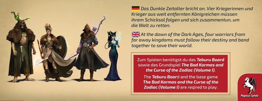 Das Dunkle Zeitalter bricht an. Vier Kriegerinnen und Krieger aus weit entfernten Königreichen müssen ihrem Schicksal folgen und sich zusammentun, um die Welt zu retten. Dies ist kein Grundspiel. Zum Spielen werden das Teburu Board und das Grundspiel The Bad Karmas and the Curse of the Zodiac Vol. 1 benötigt. Zum Spielen von TBK ist eine kostenlose digitale App erforderlich (deutsche Version verfügbar).