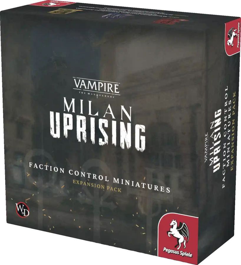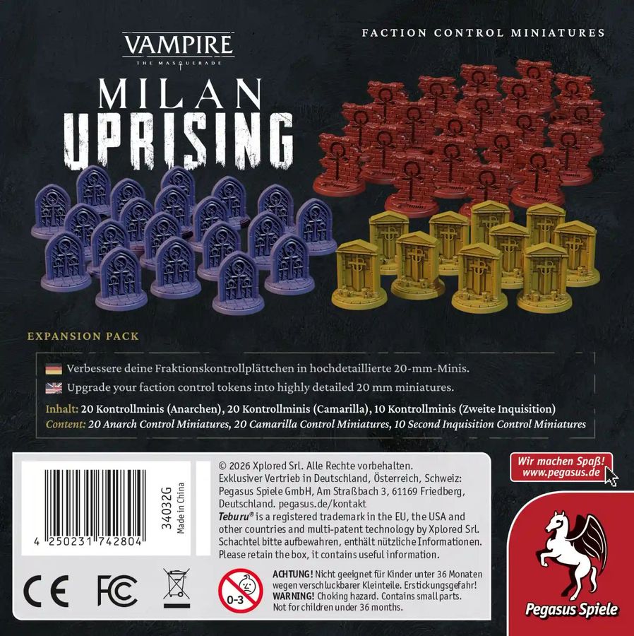 Die Faction Control Miniatures verwandeln die Fraktionskontrollplättchen in hochdetaillierte 20-mm-Minis. Dies ist ein Add-on, kein Grundspiel. Zum Spielen werden zusätzlich das Teburu Board sowie das Grundspiel Vampire: The Masquerade – Milan Uprising benötigt. Außerdem ist eine kostenlose digitale App erforderlich (deutsche Version verfügbar).