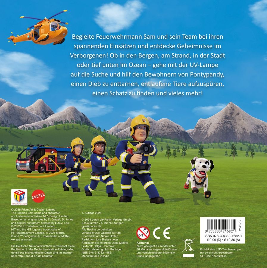 Begleite Feuerwehrmann Sam und sein Team bei ihren spannenden Einsätzen und entdecke Geheimnisse im Verborgenen! Ob in den Bergen, am Strand, in der Stadt oder tief unten im Ozean - gehe mit der UV-Lampe auf die Suche und hilf den Bewohnern von Pontypandy, einen Dieb zu enttarnen, entlaufene Tiere aufzuspüren, einen Schatz zu finden und vieles mehr!