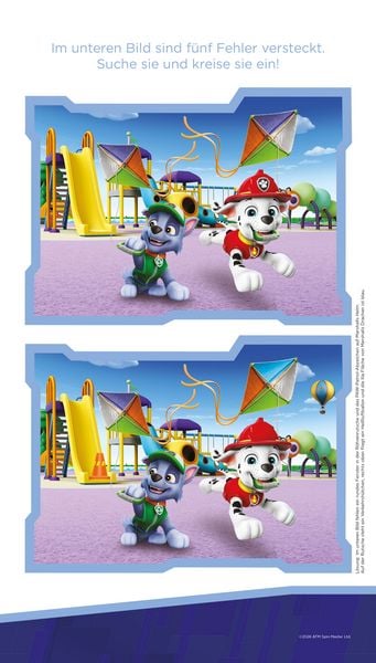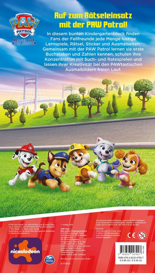 Auf zum Rätseleinsatz mit der PAW Patrol! In diesem bunten Kindergartenblock finden Fans der Fellfreunde jede Menge lustige Lernspiele, Rätsel, Sticker und Ausmalseiten. Gemeinsam mit der PAW Patrol lernen sie erste Buchstaben und Zahlen kennen, schulen ihre Konzentration mit Such- und Ratespielen und lassen ihrer Kreativität bei den pfotastischen Ausmalbildern freien Lauf.
