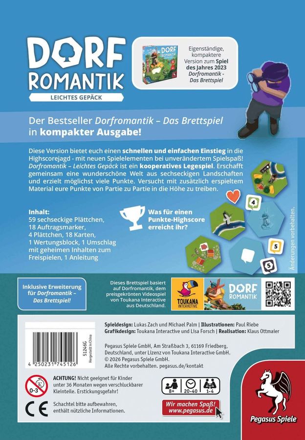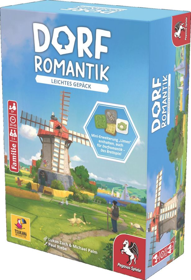 Das zum Spiel des Jahres 2023 gekrönte Dorfromantik – Das Brettspiel im kompakten Format: Ob auf Reisen, beim Picknick oder in der Mittagspause, Dorfromantik – Leichtes Gepäck ist der ideale Begleiter für unterwegs. In der praktischen Magnetbox steckt eine handliche Version des beliebten kooperativen Legespiels. Wie in Dorfromantik – Das Brettspiel legen die Spielenden gemeinsam sechseckige Plättchen, um eine idyllische Landschaft zu erschaffen, Aufträge der Bevölkerung zu erfüllen und möglichst lange Flüsse zu bauen. Je geschickter die Plättchen gelegt werden, desto höher fällt die Punktzahl am Ende einer Partie aus. Je nach Fortschritt auf der Highscore-Tabelle kommen neue Plättchen, aber auch zusätzliche Zielkarten ins Spiel – und der geheime Inhalt eines Umschlags kann freigespielt werden. Der Spielspaß bleibt beim kompakten Format erhalten, dazu bietet Dorfromantik – Leichtes Gepäck einen schnellen Einstieg in die Dorfromantik-Welt. Dorfromantik – Leichtes Gepäck inkl. Mini-Erweiterung Limes enthält neben dem Grundspiel und einer Erweiterung für Dorfromantik – Das Brettspiel zusätzlich auch die Mini-Erweiterung Limes, die ebenfalls mit Dorfromantik – Das Brettspiel kompatibel ist. Die Limes Mini-Erweiterung ist in Zusammenarbeit mit dem LVR anlässlich des fünften Jubiläums der Anerkennung des Niedergermanischen Limes als UNESCO-Welterbe entstanden. Die Materialien kommen ins Spiel, sobald die Gruppe einen Highscore von 200 oder mehr Punkten erreicht hat. Ab der nächsten Partie stehen ihnen dann 8 Limes-Marker zur Verfügung, von denen sie möglichst viele in ihrer Landschaft platzieren müssen.