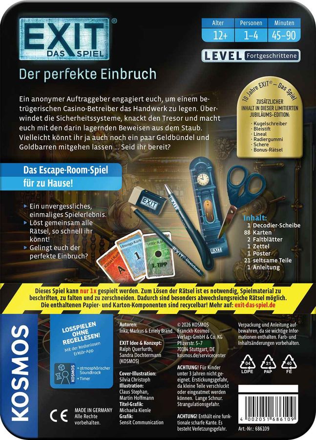 Sirenen heulen, Lichtblitze zucken, und irgendwo klirrt Glas – ein dreister Einbruch erschüttert das Kasino! Zwischen Roulettekugeln und Spielkarten beginnt ein Wettlauf gegen die Zeit. Rätselhafte Hinweise, verschlüsselte Codes und geheimnisvolle Gegenstände wollen gelöst werden, um den Fall zu knacken. Das kooperative Escape-Spiel bringt die Spannung eines Live-Escape-Raums direkt an den heimischen Tisch. Diese limitierte Jubiläumsausgabe in hochwertiger Metalldose enthält exklusive Extras im EXIT® Look – ein echtes Sammlerstück und unverzichtbar für alle Fans. Für ein bis vier Spielerinnen und Spieler ab zwölf Jahren.