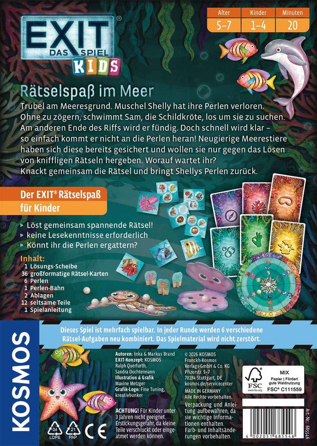 Taucht ein in das Abenteuer am Meeresgrund! Muschel Shelly hat ihre funkelnden Perlen verloren, doch Sam die Schildkröte macht sich mit ihr auf die Suche. Am anderen Ende des Riffs warten neugierige Meeresbewohner, die die Perlen nur gegen knifflige Rätsel herausgeben. Gemeinsam können ein bis vier Spielerinnen und Spieler ab fünf Jahren diese spannenden Aufgaben lösen und Sam helfen, die Perlen zurückzuergattern! Sechs immer wieder neu kombinierbare Rätsel-Arten erwarten die ein bis vier Kinder. Das Spielmaterial bleibt erhalten, so ist EXIT® - Das Spiel für Kinder immer wieder wiederspielbar.