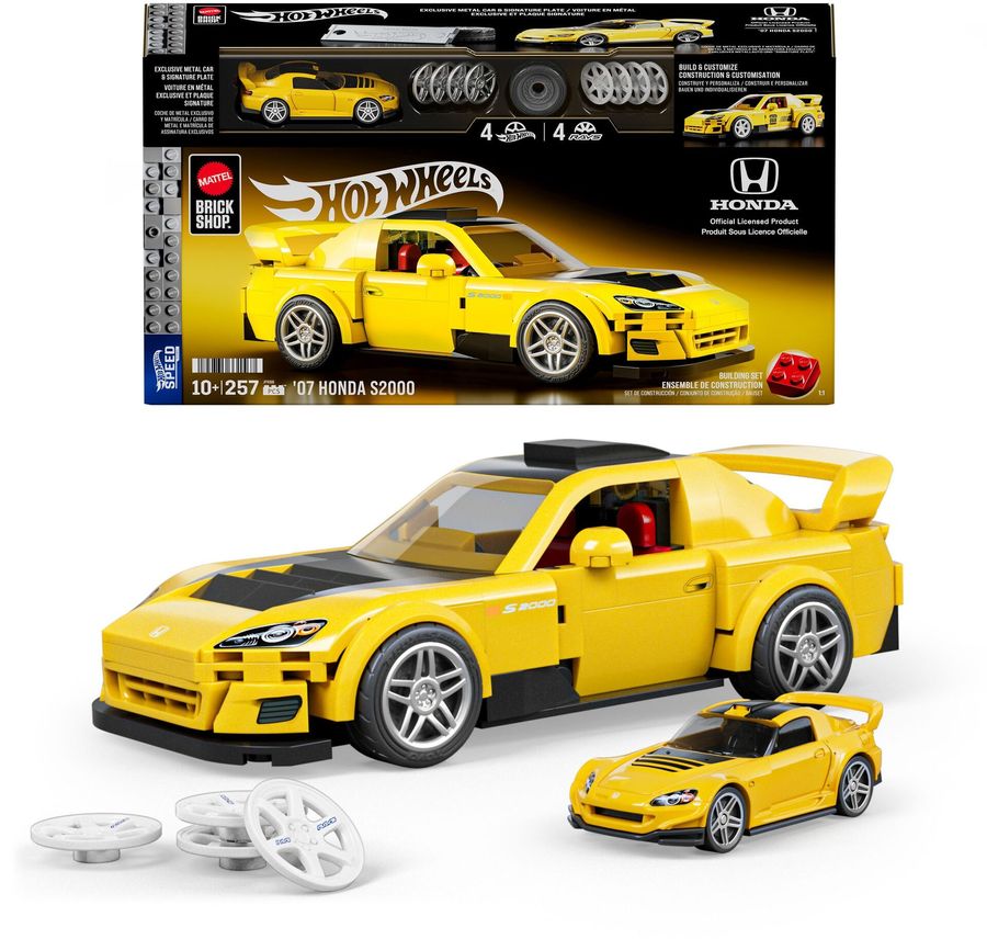 Hot Wheels Speed Serie von Mattel Brick Shop: Jedes Auto-Bauset kommt im Maßstab 1:32 mit einem exklusiven Hot Wheels Die-Cast-Auto, ein Metall- „Signature-Plate, 2 Radkappen-Sets und Aufkleber für eine individuelle Gestaltung.