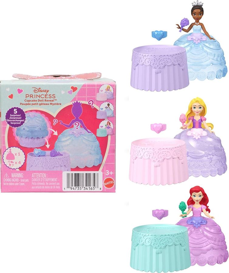 Verschenke Freude und Freundschaft zum Valentinstag mit den Cupcake Doll Reveal Spielzeugen! In jedem Cupcake verbirgt sich eine kleine Puppe und vier weitere Überraschungen – welche Disney-Prinzessin wirst du entdecken? Öffne den Cupcake und finde eine kleine Disney-Prinzessinnen-Puppe (ca. 9 cm) darin! Es könnten Tiana, Arielle oder Rapunzel sein. Die Oberseite des Cupcakes verwandelt sich in einen süßen Rock für die Puppe und die Unterseite in einen Tisch! Zwei Spielteile – ein hübscher Blumenstrauß und ein Herzring zum Anziehen – runden die Geschichte ab. Kinder können die Liebe teilen und alle drei Disney-Prinzessinnen-Puppen sammeln!
