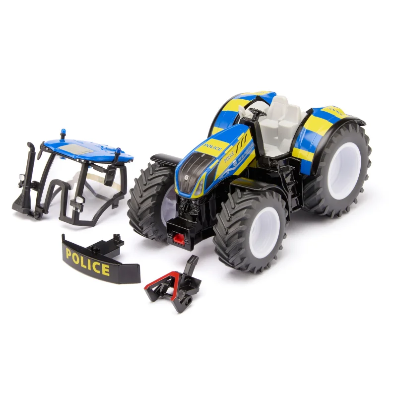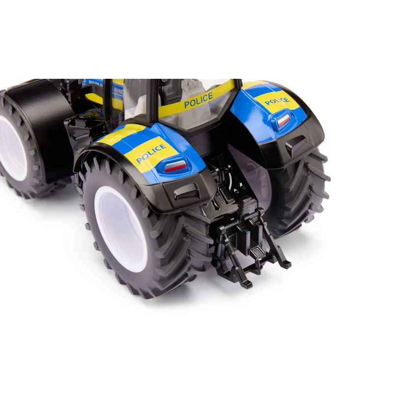 New Holland Polizei Traktor – Starke Helfer im Spielzeugparadies - Der New Holland Polizei Traktor meldet sich mit Polizeilogo auf dem Traktor zurück und macht sich bereit für spannende Einsätze im Kinderzimmer. Die Karosserie des siku-Modells besteht aus Metall, die Kabine ist verglast und abnehmbar. Auch im Innenraum sorgt die detaillierte Gestaltung für echtes Traktor-Feeling. Mit zu öffnender Motorhaube, beweglicher Vorderachse mit Achsschenkellenkung sowie siku-Standardkupplungen an Front und Heck ist der Traktor für jede Mission gerüstet und mit sämtlichen Anhängern und Zubehör der siku-Farmer-Serie kompatibel. Als Zubehör liegt ein Frontgewicht mit Polizei-Bedruckung bei, das sich über einen einfachen Mechanismus schnell an der Frontkupplung wechseln lässt. Die großen, typischen Traktorräder runden das Bild eines robusten Spielzeug-Helden ab. Dieses neue Modell reiht sich in eine Vielzahl realistischer Details ein, die das Zusammenspiel von Landwirtschafts- und Polizeieinsätzen authentisch erlebbar machen. Ein Modell-Set für kleine Macher, die Ordnung ins Spiel bringen und echte Teamarbeit erleben wollen – Präzision, Stil und Spielspaß vereint in einem Fahrzeug.