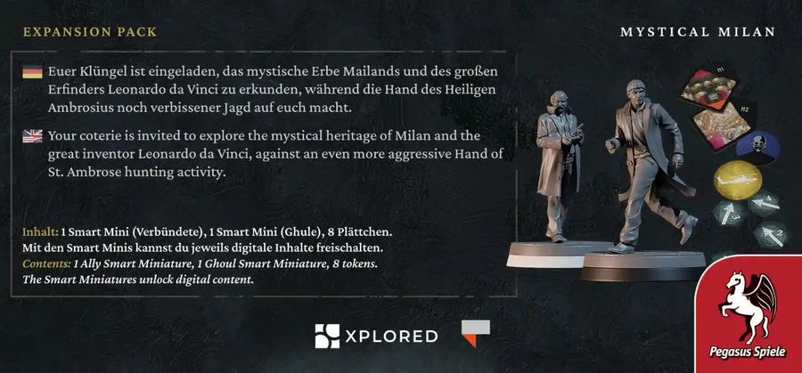 Euer Klüngel ist eingeladen, das mystische Erbe Mailands und des großen Erfinders Leonardo da Vinci zu erkunden, während die Hand des Heiligen Ambrosius noch verbissener Jagd auf euch macht. Mit dieser Story-Erweiterung Mystical Milan werden ca. 4 Stunden an neuen, digitalen Inhalten im Grundspiel Vampire: The Masquerade – Milan Uprising freigeschaltet, die die Spielenden noch tiefer in die Geschichte eintauchen lassen. Dies ist eine Erweiterung, kein Grundspiel. Zum Spielen werden zusätzlich das Teburu Board sowie das Grundspiel Vampire: The Masquerade – Milan Uprising benötigt. Außerdem ist eine kostenlose digitale App erforderlich (deutsche Version verfügbar).