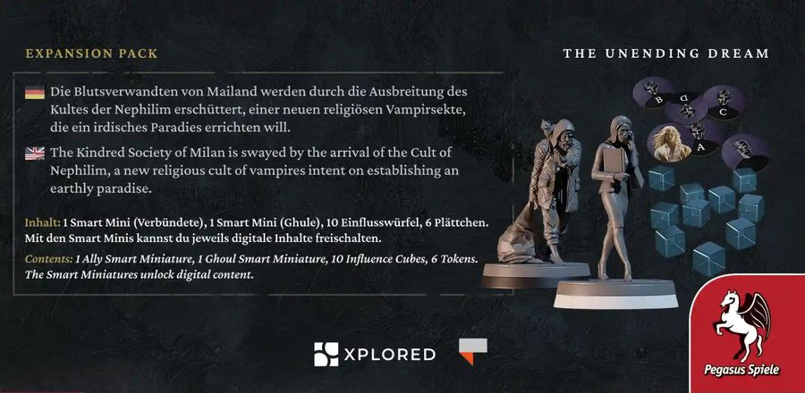 Die Blutsverwandten von Mailand werden durch die Ausbreitung des Kultes der Nephilim erschüttert, einer neuen religiösen Vampirsekte, die ein irdisches Paradies errichten will. Mit dieser Story-Erweiterung The Unending Dream werden ca. 4 Stunden an neuen, digitalen Inhalten im Grundspiel Vampire: The Masquerade – Milan Uprising freigeschaltet, die die Spielenden noch tiefer in die Geschichte eintauchen lassen. Dies ist eine Erweiterung, kein Grundspiel. Zum Spielen werden zusätzlich das Teburu Board sowie das Grundspiel Vampire: The Masquerade – Milan Uprising benötigt. Außerdem ist eine kostenlose digitale App erforderlich (deutsche Version verfügbar).